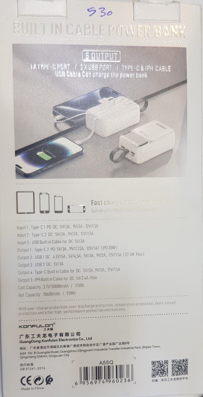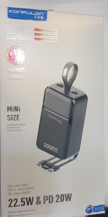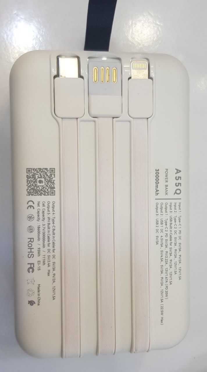 پاوربانک سوپر فست 30هزار 30000 میلی آمپر 4 خروجی فست و سوپر فست توان 22.5وات ظرفیت بالا دارای 3 کابل متصل