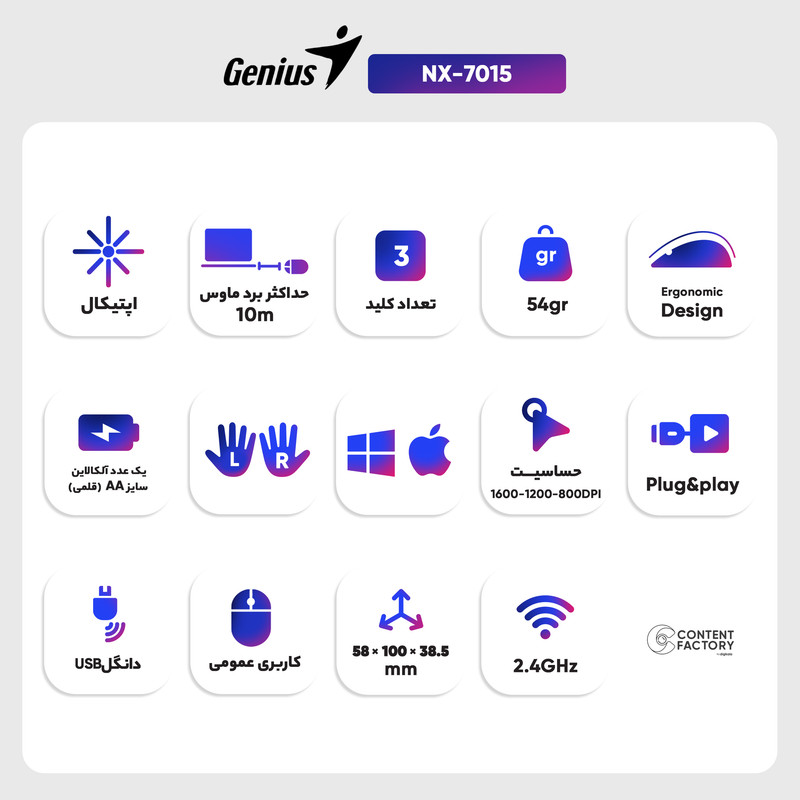 ماوس NX-7015 محصولی دوستداشتنی از شرکت جنیوس است که از طریق دانگل USB به رایانه شما متصل میشود. به یاری پشتیبانی از فرکانس 2.4 گیگاهرتزی، این ماوس میتواند از فاصله 10 متری از رایانه شما به کنترل اشارهگر رایانه بپردازید. حسگر ماوس جنیوس مدل NX-7015 از نوع اپتیکال بوده و به یاری آن میتوان روی انواع سطوح از این ماوس استفاده کنید. این ماوس از سه کلید برای اجرای درخواستهای کاربر استفاده میکند. به یاری وجود سنسور اپتیکال ارایه شده روی NX-7015 از این ماوس میتوان روی سطوح مختلف به راحتی استفاده کرد. این ماوس شرکت جنیوس انرژی خود را از یک باتری قلمی تامین میکند و با انواع سیستمعاملهای رایج سازگار است. یکی از فاکتورهای بسیار مهم هنگام انتخاب یک ماوس میزان دقت آن است. ماوس بیسیم NX-7015 از میزان دقت مختلفی بهره میبرد که به یاری وجود آن میتوان با سرعت بسیار بالا اشارهگر ماوس را از نقطهای به نقطه دیگر صفحهنمایش منتقل کنید. ماوس بیسیم جنیوس مدل NX-7015 درابعاد بسیار مناسبی طراحی شده است و برای حمل بسیار مناسب است.