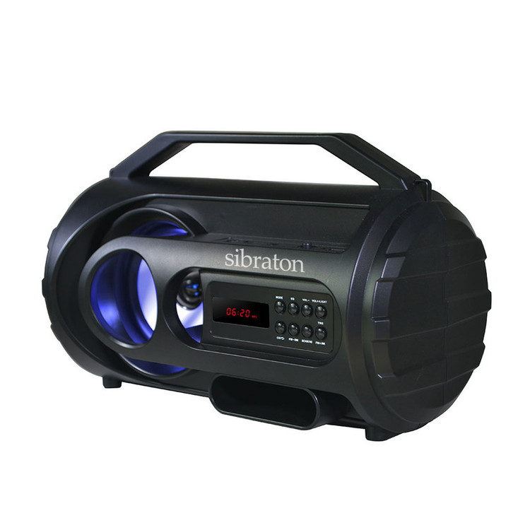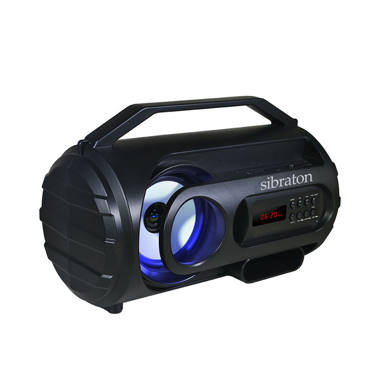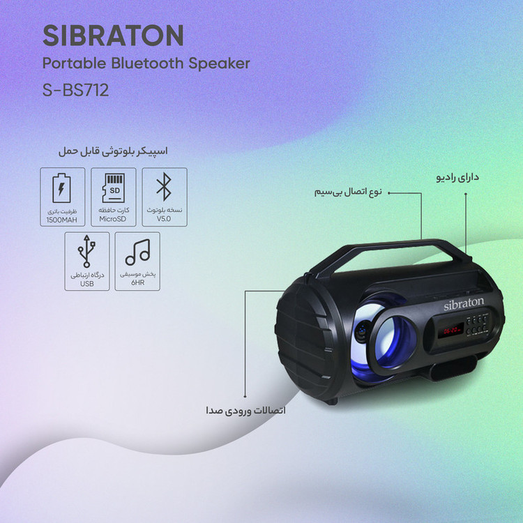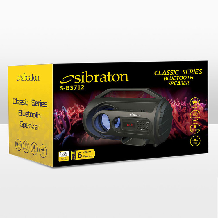 اسپیکر S-BS712 سیبراتون از دیگر محصولات سری کلاسیک است که توسط کمپانی « سیبراتون » (SIBRATON) تولید و در بازار ایران عرضه شده است. این محصول حرفه ای مانند یک جعبه جادویی است و در قسمت بالایی آن دسته ای جهت سهولت حمل قرار گرفته است بر روی آن صفحه نمایش LED را شاهد هستید که در هنگام یافتن ترک و تنظیم مود به شما کمک خواهد کرد. این اسپیکر با ابعاد 284x145x177میلی متر دارای یک اسپیکر با توان خروجی8 وات است و ارائه صدایی با کیفیت شفاف را توسط آن ممکن کرده است. این محصول را در اتاق خود بگذارید و از موسیقی لذت ببرید و یا آن را در دورهمی ها و مهمانی های خود با خود همراه داشته باشید و ضیافت خود را جلال بخشید. این اسپیکر بلوتوثی از فلش مموری و کارت میکرو و AUX پشتیبانی میکند. پس شما علاوه بر اتصال از طریق بلوتوث می توانید با یک کابل AUX و یا فلش مموری و حتی کارت میکرو لیست موزیک های مورد علاقه خود را با این اسپیکر پخش کنید. نقطه عطف دیگر آن قابلیت سینک اسپیکر با اسپیکر همنام دیگر است.