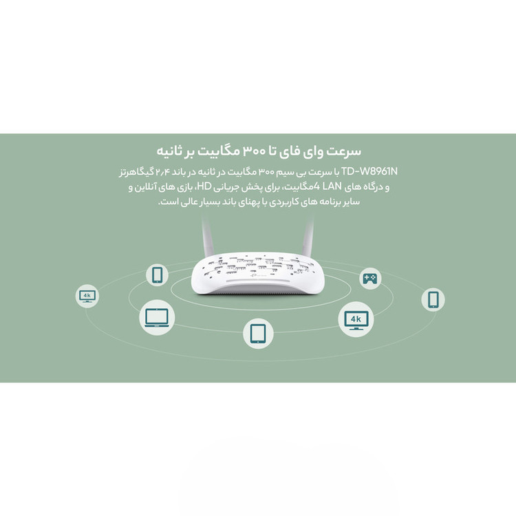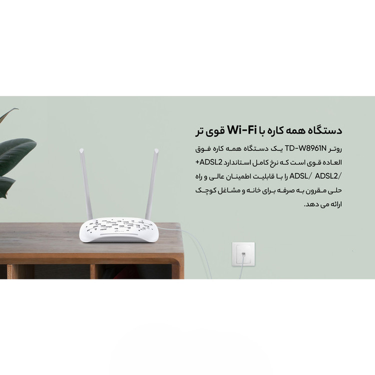 تیپی-لینک W8961N یک مودمروتر +ADSL2 است که از 4 عدد پورت شبکه (RJ-45) برای اتصال بهصورت باسیم، دو عدد آنتن برای اتصال بیسیم و یک عدد پورت RJ-11 برای اتصال خط تلفن بهره میبرد. این محصول، ترکیبی از عملکردهای یک مودم +ADSl2 با سرعت بالا، یک روتر بیسیم و یک اکسس پوینت بیسیم است و از نسل سوم استانداردهای بیسیم یعنی سری N هم بهره میبرد. به همین دلیل قادر است حداکثر سرعت 300 مگابیت بر ثانیه را که سرعت خوبی است، برای برقراری ارتباط بیسیم ارائه دهد؛ البته این عدد 300 مگابیت بر ثانیه، نشاندهندهی حداکثر سرعت انتقال اطلاعات در شبکهی بیسیم توسط این مودم است و به سرعت اینترنت شما هیچ ارتباطی ندارد. مودم بیسیم W8961N برای کاربری خانگی، یک دفتر کار کوچک با حداکثر 4 کامپیوتر و کارهایی مانند انجام بازیهای آنلاین، مکالمهی اینترنتی و حتی پخش ویدیو HD نیز مناسب است و میتواند قابلیتهای رمزگذاری WPA-PSK و WPA2-PSK را به شما عرضه کند.
