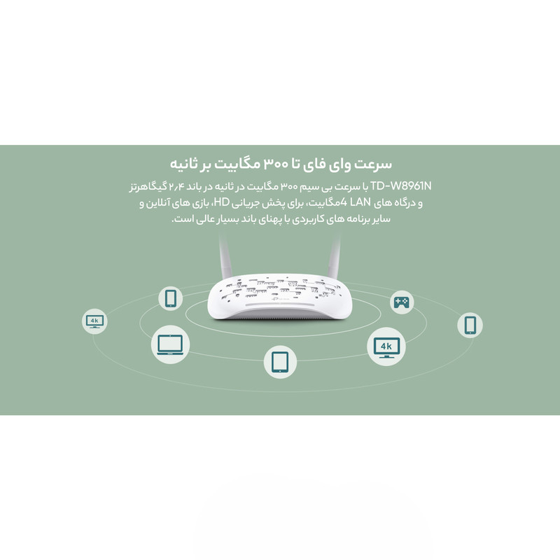 تیپی-لینک W8961N یک مودمروتر +ADSL2 است که از 4 عدد پورت شبکه (RJ-45) برای اتصال بهصورت باسیم، دو عدد آنتن برای اتصال بیسیم و یک عدد پورت RJ-11 برای اتصال خط تلفن بهره میبرد. این محصول، ترکیبی از عملکردهای یک مودم +ADSl2 با سرعت بالا، یک روتر بیسیم و یک اکسس پوینت بیسیم است و از نسل سوم استانداردهای بیسیم یعنی سری N هم بهره میبرد. به همین دلیل قادر است حداکثر سرعت 300 مگابیت بر ثانیه را که سرعت خوبی است، برای برقراری ارتباط بیسیم ارائه دهد؛ البته این عدد 300 مگابیت بر ثانیه، نشاندهندهی حداکثر سرعت انتقال اطلاعات در شبکهی بیسیم توسط این مودم است و به سرعت اینترنت شما هیچ ارتباطی ندارد. مودم بیسیم W8961N برای کاربری خانگی، یک دفتر کار کوچک با حداکثر 4 کامپیوتر و کارهایی مانند انجام بازیهای آنلاین، مکالمهی اینترنتی و حتی پخش ویدیو HD نیز مناسب است و میتواند قابلیتهای رمزگذاری WPA-PSK و WPA2-PSK را به شما عرضه کند.