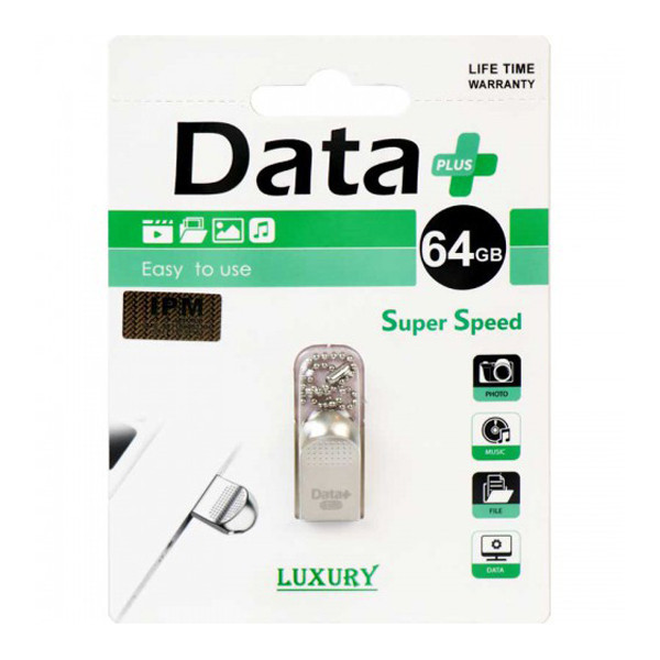 فلش Data+ Luxury دارای ظرفیتی معادل 64 گیگابایت بوده و به شما اجازه انتقال حجم نسبتا بالایی از دیتا و اطلاعات را می دهد، بدون اینکه نگران پر شدن ظرفیت فلش باشید. با استفاده از این ظرفیت می توانید تعداد قابل قبولی فیلم با کیفیتی خوب را انتقال دهید و یا حتی همیشه همراه خود داشته باشید در فلش مموری خود نگهداردید؛ همچنین قادر هستید تا حجم بالایی از موزیک را درون فلش ریخته و فلش مموری را در خودرو قرار دهید و از گوش دادن به موسیقی لذت ببرید، این حجم بالا از موسیقی باعث کمتر شنیده شدن آهنگ های تکراری نیز می شود و همین طور می توانید مدتی یکبار به لیست ترک های خود بیافزایید. از دیگر ویژگی هایی که این محصول دارد، امکان اتصال بند به آن می باشد که توسط بند می توانید فلش را به جاکلیدی خود متصل کرده و مانع از گم شدنش بشوید و همیشه Luxury را همراه خود داشته باشید. همان طور که مشاهده می کنید، بدنه این فلش فلزی بوده و همین عامل سبب بالا رفتن مقاومت دیتا پلاس در برابر برخی ضربات و فشارها می شود. سایز بند انگشتی Luxury نیز از ویژگی های دیگری است که می توان به آن اشاره کرد و مزیتی است که باعث کمتر اشغال شدن فضا توسط فلش می شود.